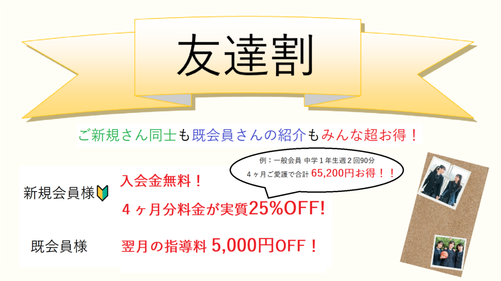 | ご新規様 ご新規様同士 | 入会金無料! 4ヶ月目の指導料が無料! 入会金無料+4か月分の指導料を実質25%OFFでご利用可能 |